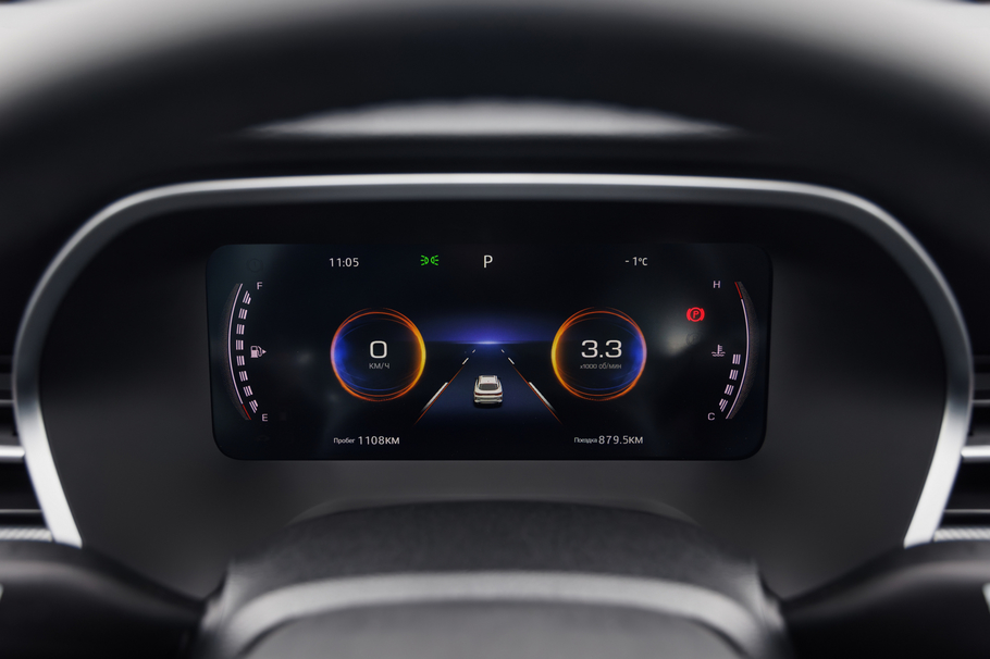Вырастающий как бы из центральной консоли вертикальный планшет имеет диагональ 10,4 дюйма. Он крупный, но, к счастью, не настолько, чтобы своей верхней часть вылезать за уровень торпед, ограничивая обзор. Картинку даёт отличную (разрешение 1 млн пикселей), о чём можно судить по выводимой на него навигации или данных от системы кругового обзора, работающей с 4 широкоугольными камерами. Блок управления основными функциями располагает несколькими физическими кнопками, и это было бы совсем приятно, если бы не одно «но»: то же подогрев передних кресел здесь отсутствует, приходится залезать в электронное меню, что совсем не удобно.