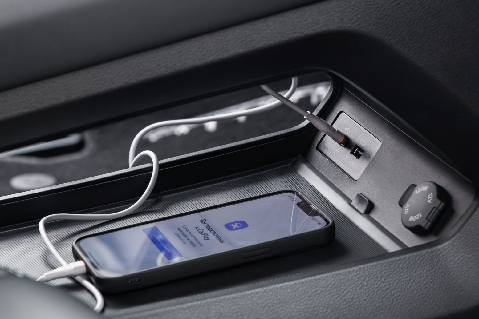 Каждый из задних седоков может воспользоваться USB-разъёмом для подзарядки своего смартфона – их тут два. Столько же на 1 этаже двухуровневой центральной консоли – без электричества автомобиль не оставит никого. Тоннель, разделяющий кресла водителя и пассажира, отдан под кнопку «Старт/стоп», рычаг трансмиссии, а также клавишу электронного стояночного тормоза. Ближе к боксу есть еще одна кнопка, и это (что удивительно) «Эра-Глонасс». Аналогичная «локация», как мы недавно писали, у пикапа Dongfeng DF6, и это вынужденная мера.