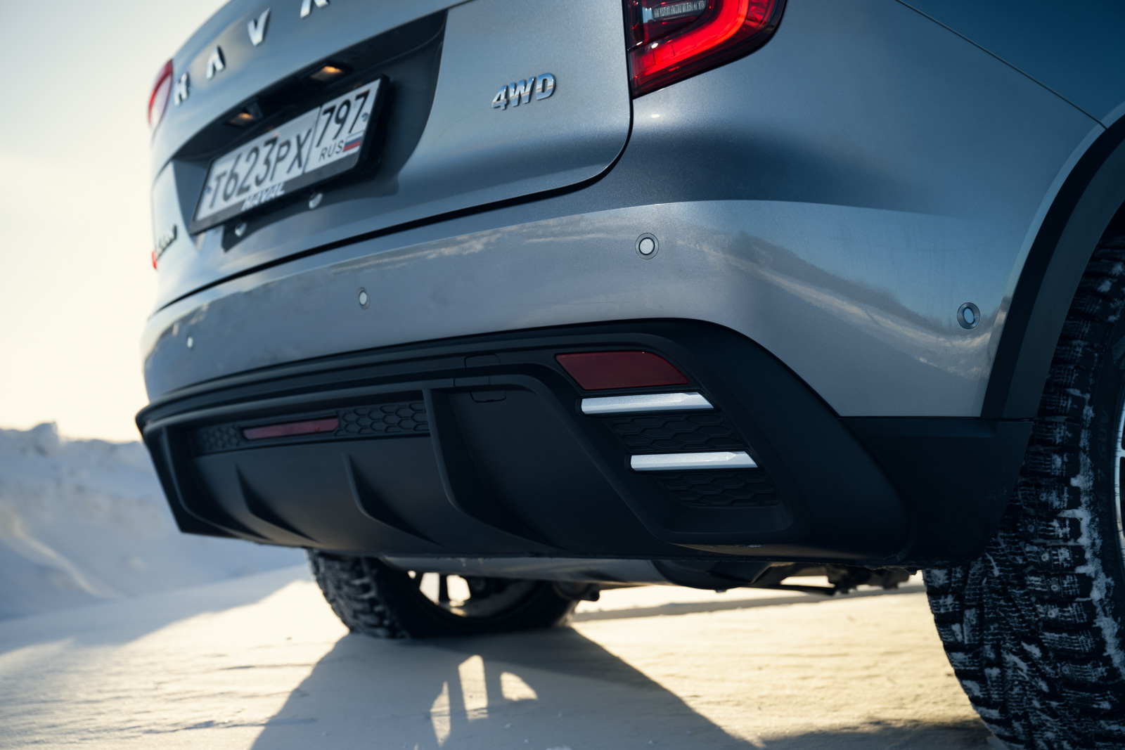 Можем наблюдать изменившуюся форму заднего бампера, крупный спойлер на задней двери и долгожданные накладки на колёсные арки – они тоже из чёрного пластика. Ламели радиаторной решётки отныне вертикальные, словно в унисон дневным ходовым огням. А «18-е» колёса (доступные с третьего уровня комплектации) посажены на свежие диски – они отечественного производства. Чьего именно, в Haval не говорят, но, согласитесь, в стране не слишком много качественных производителей подобной продукции.