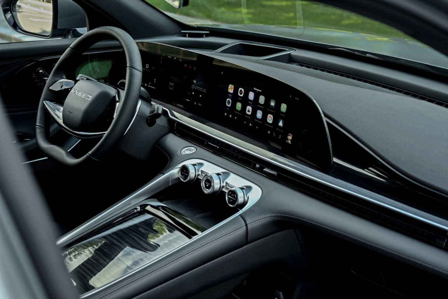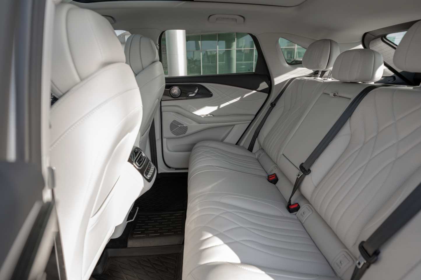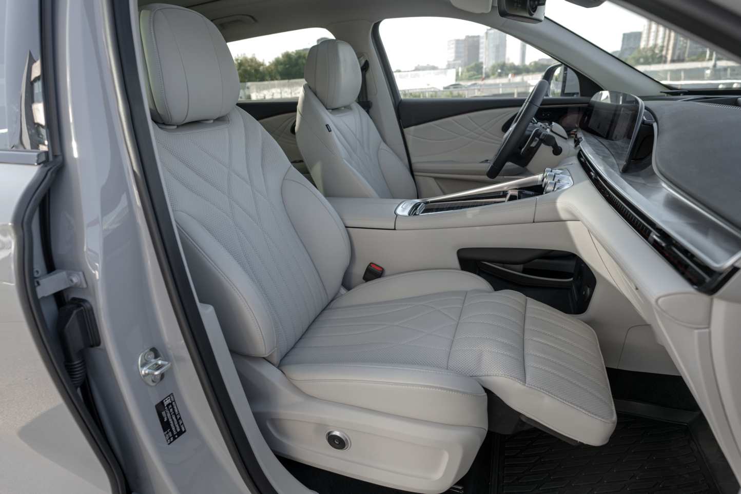 Все, что смонтировано внутри автомобиля, сработано на славу. Отличные и тонко подогнанные материалы, роскошные кресла обоих рядов, удобный и чуть скошенный снизу руль, наконец, сдвоенный изогнутый экран диагональю 24,6 дюйма. Благодаря процессору Qualcomm Snapdragon 8155, загрузка меню происходит быстро (скорость запуска и загрузки экрана — менее 3 секунд, переключение – менее 1 секунды), а качество изображения вне нареканий. Поддержка Android Auto и Apple CarPlay – само собой, обновление «по воздуху». Предусмотрены беспроводная зарядка мощностью 50 Вт, проекционный дисплей (до этого встречался лишь на VX), двухзонный климат, ароматизация воздуха с 3 видами ароматов в картриджах, технология разблокировки электрозамков дверей и пр.