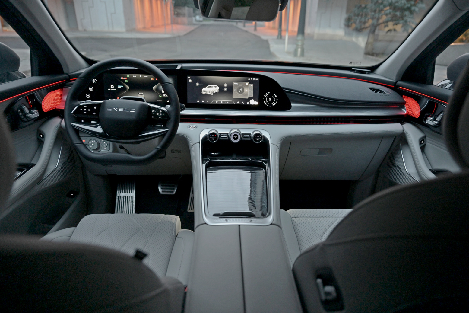 Мотор, в свою очередь, тянет. И тянет прилично — как-никак 385 Нм момента. По «железу» он тот же самый, что устанавливается на крупногабаритный 7-местный Exeed VX. Просто для RX немного изменили настройки, сделав акцент на более эффективной и экономичной езде на средних оборотах. При идеальных условиях обещают расход 7,6 л/100 км. Сколько на самом деле следует к этому приплюсовать, зависит от конкретных условий и манеры педалирования.