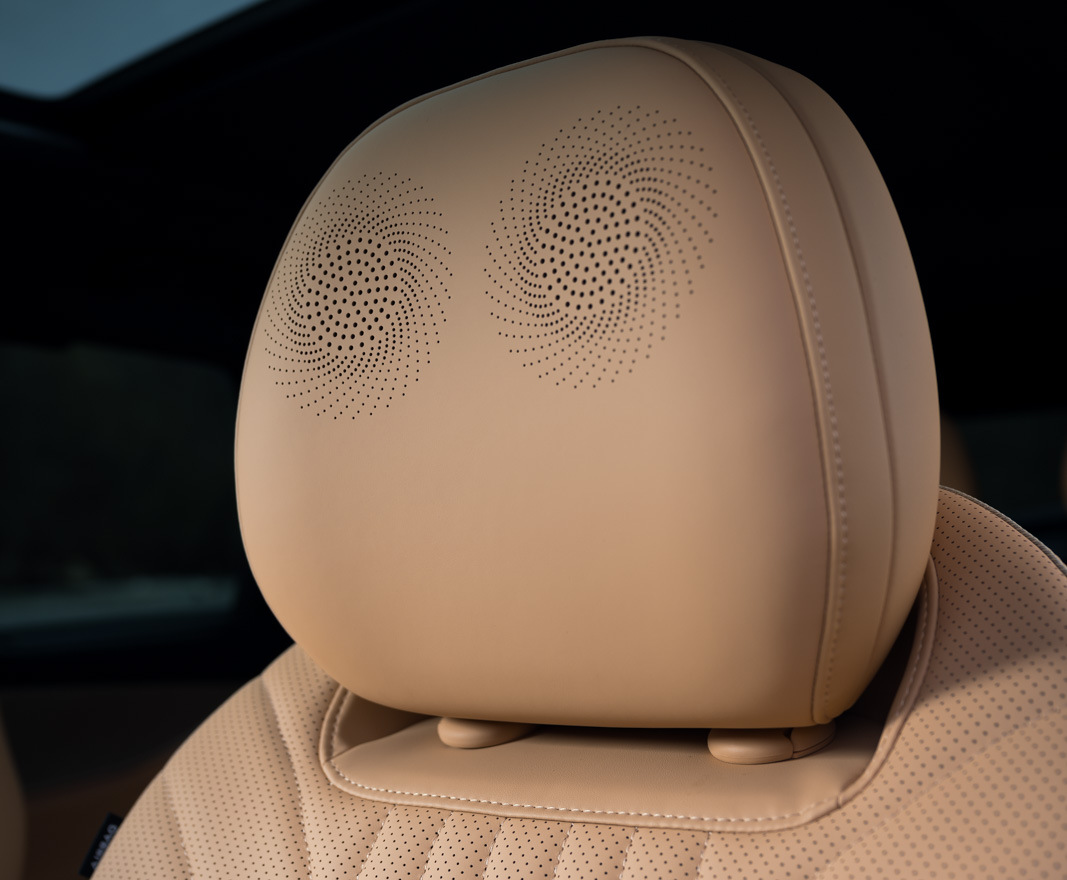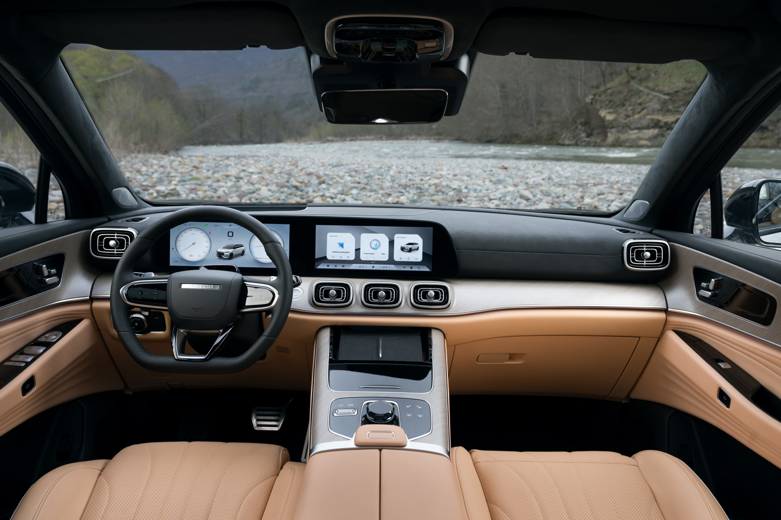 Внутри появился чёрный потолок, его, по словам Ивана Максимова, просили клиенты. У J7 такого потолка пока нет, но точно будет. У чёрного и коричневого интерьера отделка разная. Кругом минимум физических кнопок. Музыка – Sony с 14-ю динамиками, в том числе с двумя, упрятанными в подголовник водителя – это в топовой комплектации (а так 12 шт.). Когда оставляешь звук только в подголовнике, непривычно становится при разговоре по телефону — будто кто-то шепчет на ухо. Опять же рекордное количество подушек безопасности — 10, включая коленную. 3 аэрбега, что называется, особенные: центральный во время удара не даст головам передних седоков выбить друг другу мозги, плюс боковые «надувнушки» на заднем диване. Есть активный преднатяжитель ремня безопасности – в активном повороте прямо цепляется за тело.