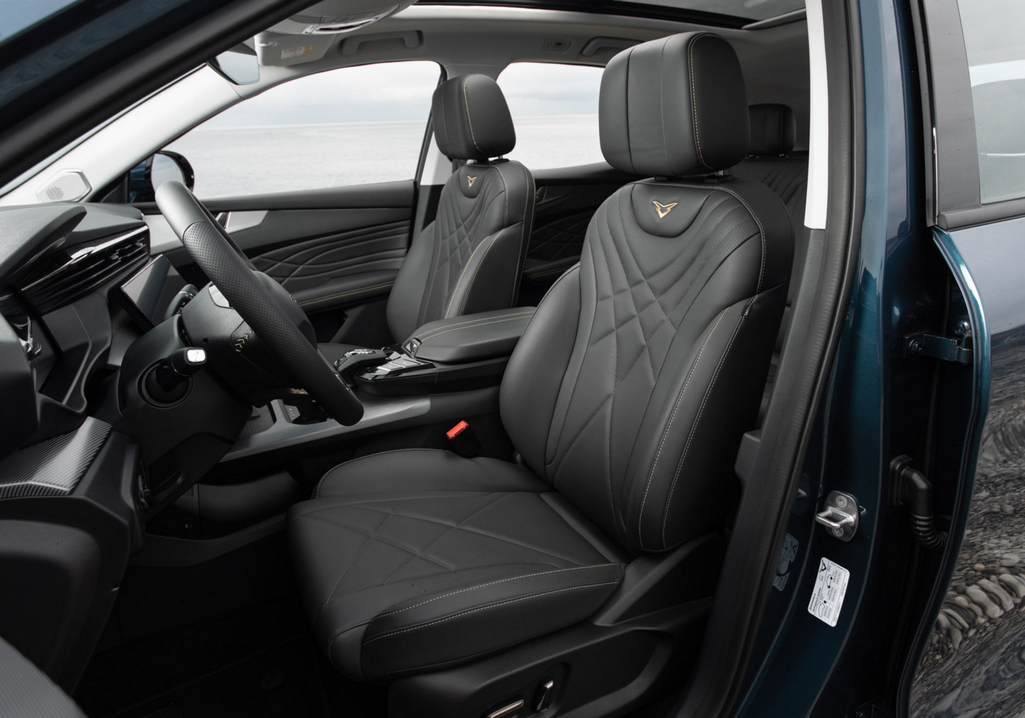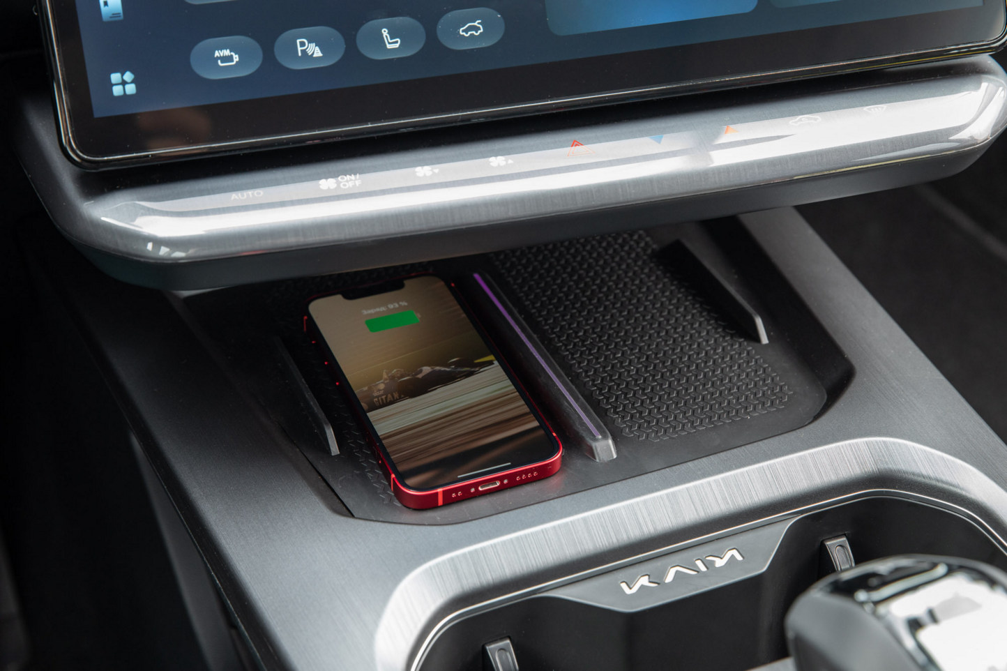 Передние кресла спроектированы специально для «Куньлуня», они также удобные. Водительское имеет 6 электрорегулировок, подогрев и вентиляцию, чего не скажешь о пассажирском сиденье сбоку – регулировки исключительно механические, даже в топовой комплектации. Руль регулируется во всех плоскостях и, что самое необычное, в обилии «населяющих» его клавиш можно встретить кнопку запуска двигателя. Посередине огромный экран мультимедиа, под ним панель с физическими кнопками (климат, зеркала и пр.), а ещё ниже прорезиненный слот беспроводной зарядки — 7,5 Вт для «Айфона» и 9 Вт для «Андроида». Салонное зеркальце имеет непривычную пятигранную форму, но вполне себе «читаемое».