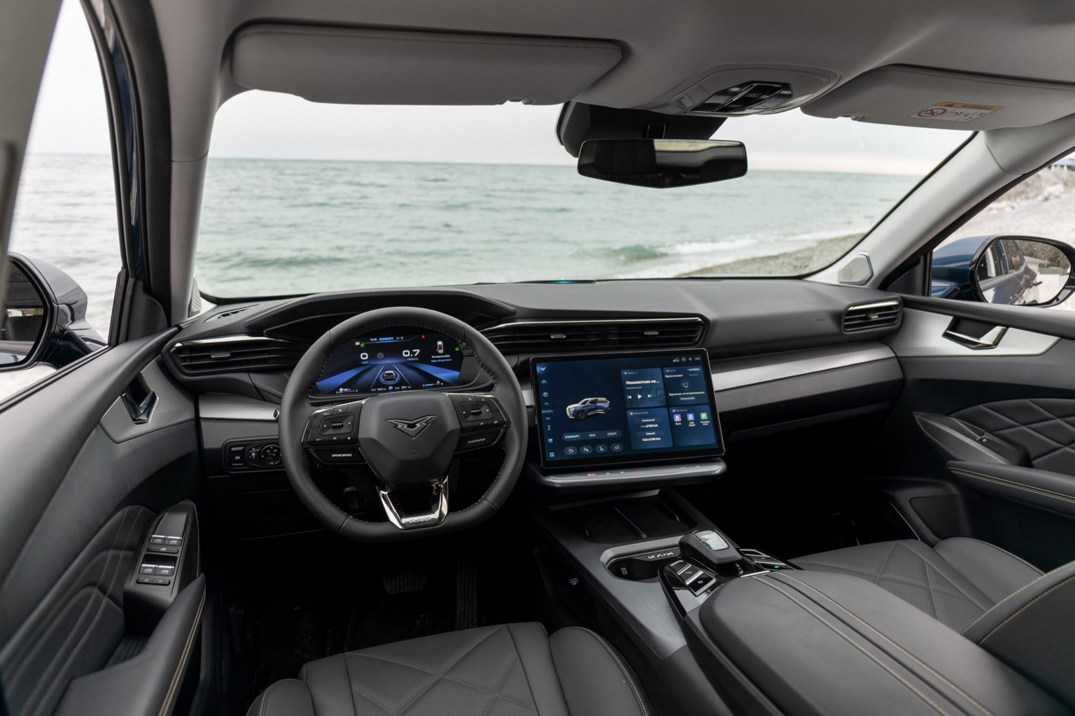 Селектор управления трансмиссией – нечто из мира фантастики. Но при этом он интуитивно понятный — двигаешь вперёд-назад, в зависимости от того, куда надо трогаться, и ни шагу в сторону. Два раза активировать режим Drive, как на ряде китайских машин, не нужно – достаточно одной команды.