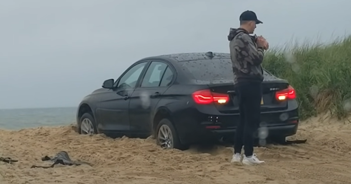 Водитель BMW 3 серии случайно оказался снаружи своего автомобиля, когда тот буксовал в песке.