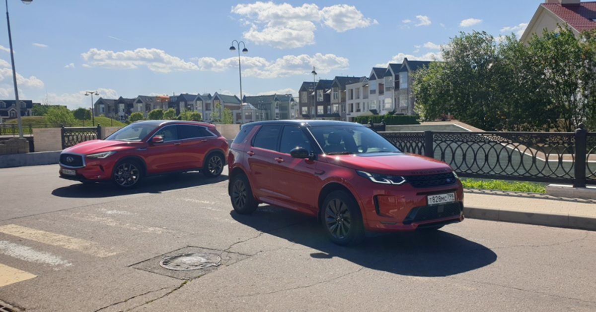 Для ответа на этот вопрос мы взяли обновлённый Land Rover Discovery Sport, а в пару к нему Infiniti QX50. Скажете, что не конкуренты, хотя и достались они нам почти в одинаковых цветах? Да, у «Диско» — внедорожные корни, а «Финик» — скорее, асфальтовый боец. Но цены на них практически одинаковые, а габариты очень похожи.