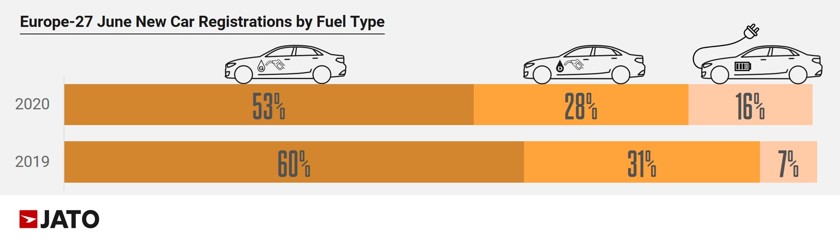 Если в июне прошлого года электрифицированные автомобили (а это не только чистые электрокары, но и гибриды) занимали около 7% рынка, то в июне 2020 года речь идет уже о 16,2%!