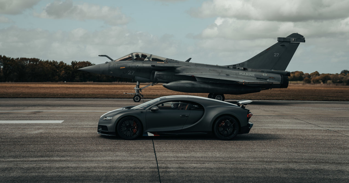 Компания Bugatti устроила гонку гиперкара с французским палубным истребителем Dassault Rafale.