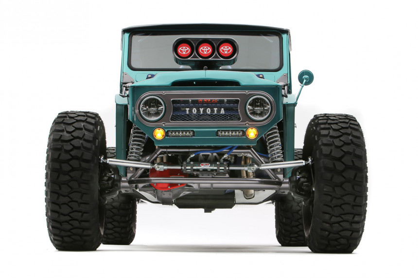 Toyota FJ Bruiser полностью оправдывает свое имя, которое в переводе с английского означает «громила». Изначально это был скромный пикап Toyota Land Cruiser FJ45 образца 1966 года, однако в процессе доработки от него остались только некоторые внешние панели кузова. Bruiser базируется на полностью оригинальной трубчатой раме, в длинноходной подвеске (с двумя неразрезными мостами) установлены амортизаторы Fox и пружины Eibach. Опирается этот здоровяк на 20-дюймовые колеса, обутые в злые внедорожные покрышки BFGoodrich Krawler T/A KX внешним диаметром 42 дюйма. Под капотом расположился двигатель V8 объемом 5,9 л мощностью 735 л.с., заимствованный у тойотовского болида серии NASCAR и работающий в паре с трехступенчатым «автоматом». Bruiser может как ползать по камням, так и разгоняться до 266 км/ч по асфальту. А для экстремального бездорожья под брюхом машины установлена… гусеница с цепным приводом!