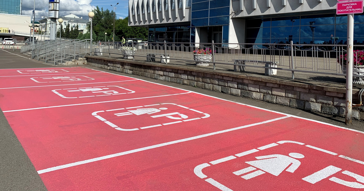 На этой стоянке парковочные места для автомобилей шире, чем у обычных — 4,4 метра вместо 2,5 метра. Рядом стоит знак с надписью «Парковка для покупательниц».