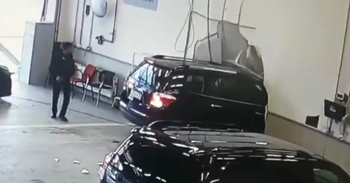 На кадрах видно, как водитель пытается припарковать автомобиль внутри здания. В какой-то момент машина резко набирает скорость и влетает в стену, после чего оказывается в другом помещении.