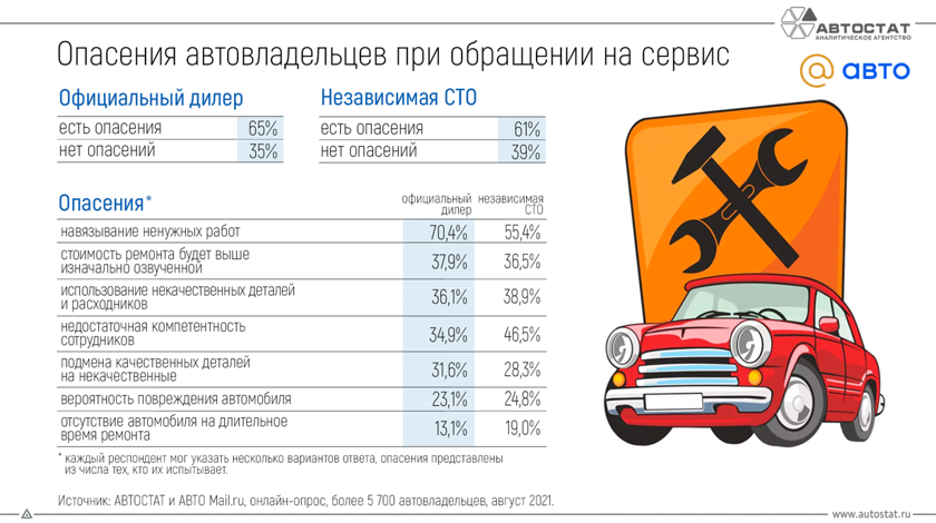 Правда, с 2018 года количество автомобилистов, которые остаются с новыми машинами у дилеров, снижается (с 87,1% до 82,9%). Остальные водители пользуются независимыми СТО и механиками-частниками, либо работают с авто самостоятельно.