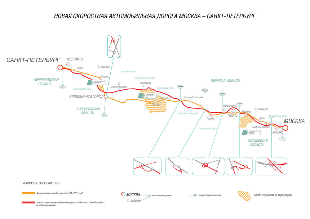 Скоростная трасса М-11 протянется от МКАД до примыкания к Кольцевой автомобильной дороге вокруг Санкт-Петербурга. Новая дорога в основном пройдет параллельно существующей автомобильной дороге М-10 «Россия» и будет пересекать ее на км 58, км 149, км 208, км 258, км 334, км 543 с устройством транспортных развязок в разных уровнях. Общая протяженность автомагистрали составляет 669 км. Проезд от Москвы до Санкт- Петербурга по платной автотрассе М-11 займет не более пяти с половиной часов.
